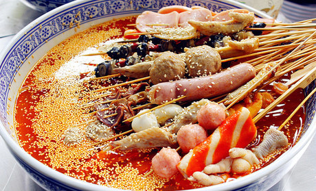 钵钵鸡是四川成都的汉族传统名小吃,属于川菜系。从清代流传至今已有上百年的历史。是以陶器钵盛放配以麻辣为主的佐料,加上多种调料的去骨鸡片拌和而成。有皮脆肉嫩、麻辣鲜香、甜咸适中的特色。吃奶汤面时配以钵钵鸡,别具风格。1990年获成都市“个体名小吃”优质奖,1991年被成都市人民政府命名为“优质名小吃”。钵钵鸡一听其名,就觉得很新奇,“钵钵”其实就是瓦罐,钵外面是画着红黄相间的瓷质龙纹,钵内盛放配以麻辣为主的佐料,菜品在特殊加工后用签串制,晾冷浸于各种口味的佐料中,食用时自取自食,除味道悠长外更添情趣盎然。